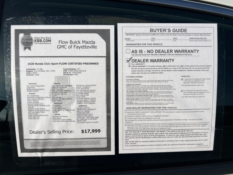 Flow Buick Mazda GMC of Fayetteville is honored to offer this gorgeous 2020 Honda Civic White Sport with the following features: FLOW CERTIFIED 2YR/100 000 MILE POWERTRAIN WARRANTY 3 day money back guarantee and a free maintenance package! ** 100 000 LIMITED POWERTRAIN WARRANTY BACK UP CAMERA COMPLIMENTARY MAINTENANCE FOR 2 YEARS/24 000 MILES FLOW QRP - OUR USED CARS GO THROUGH A 146 POINT INSPECTION No accident history on Carfax Civic Sport FLOW CERTIFIED PREOWNED 4D Sedan 2.0L I4 DOHC 16V i-VTEC CVT FWD White Gray Cloth. Priced below KBB Fair Purchase Price!