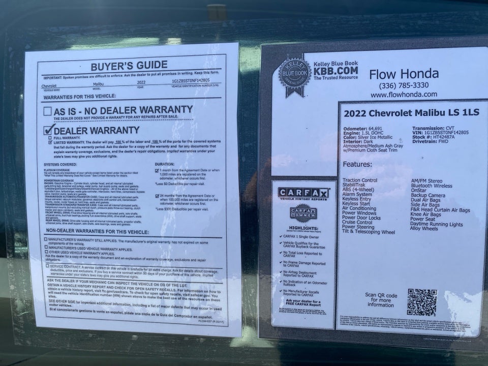 FLOW CERTIFIED! 2YR/100 000 MILE WARRANTY with $300 deductible and a free maintenance package on this 2022 Chevrolet MalibuSilver Ice Metallic LS! **