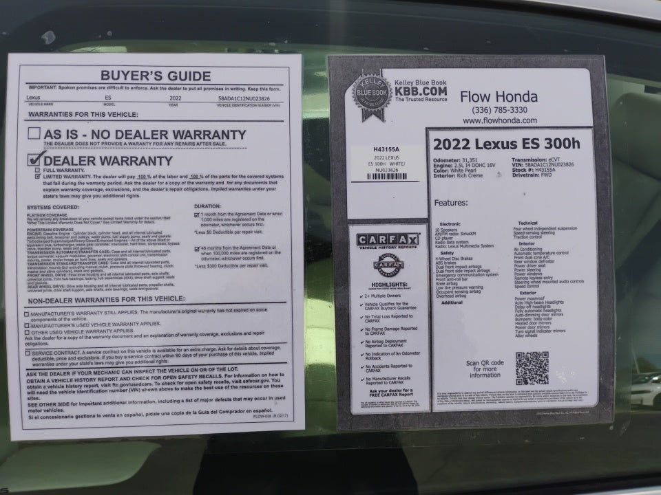 FLOW CERTIFIED! 4YR/100 000 MILE WARRANTY with $300 deductible and a free maintenance package on this 2022 Lexus ES White Pearl 300h! **